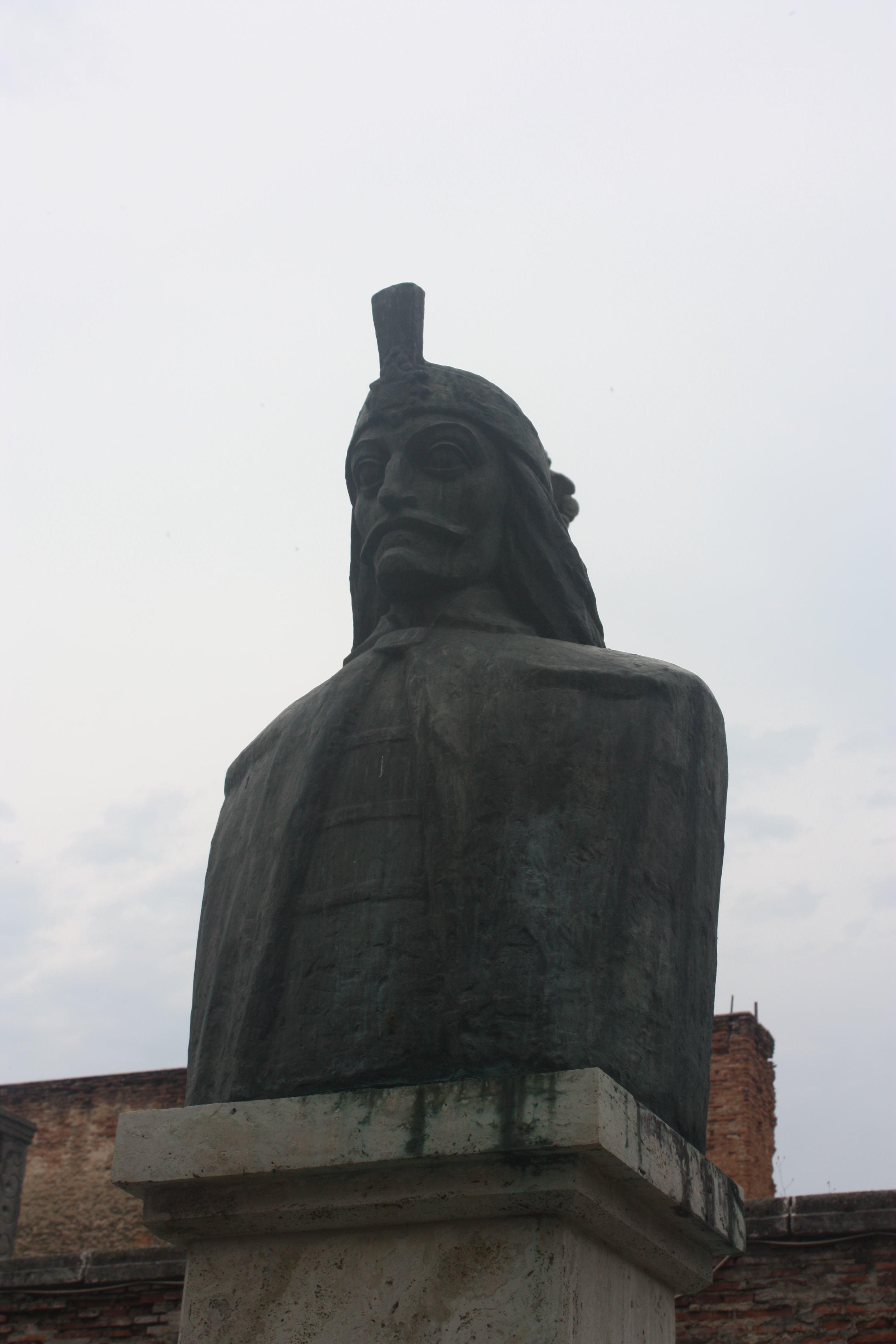 A bust of Vlad the Impaler, the model more or less for Bram Stoker’s Dracula is on a pedestal outside the remains of his 15th century residence.