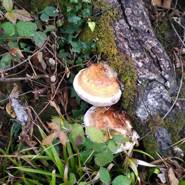 The fungus attached to a log I must have walked by at least half a dozen times without noticing. If I remember my grade-school biology, those things don’t grow that swiftly. Maybe I have walked by it for four years and never noticed.