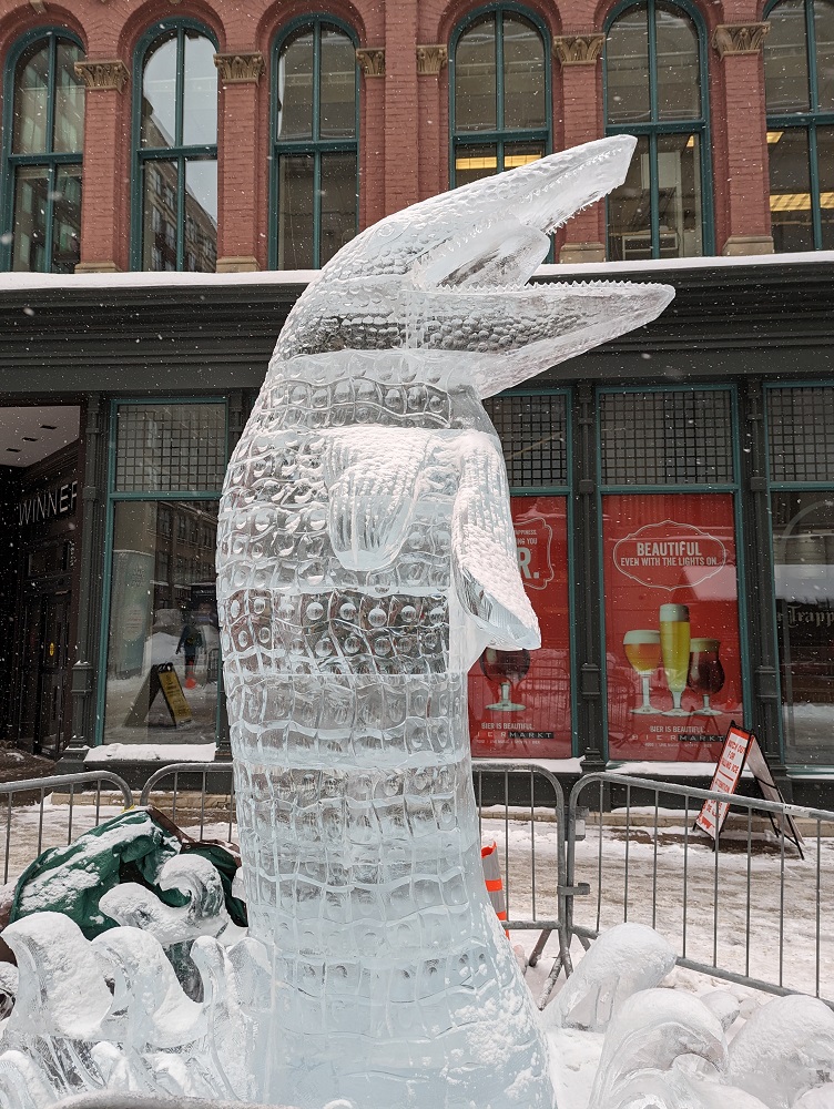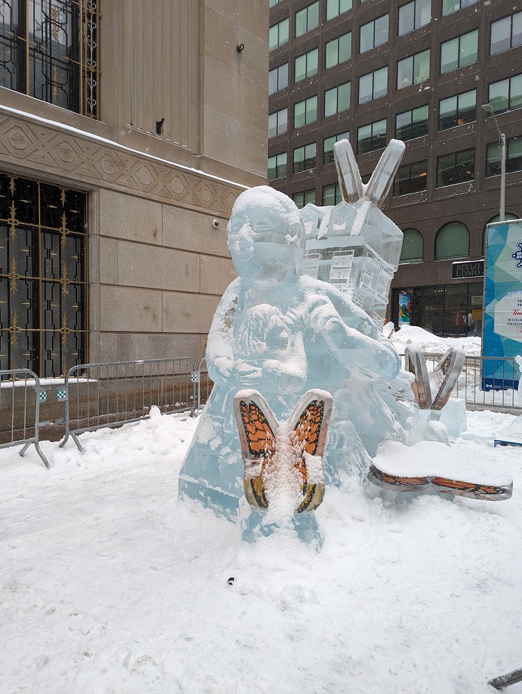 Not all of the ice carving sculptures on Sparks Street have been revealed yet, so I’m not ready to cast my vote. Also, it was snowing Monday afternoon, and I want to see how the sculptures look in the sunshine with the snow brushed off. I only looked at these ones because I was walking down Sparks anyway.
