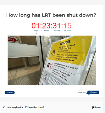 Yesterday I mentioned that I had wanted to link to the online clock that showed how long Ottawa’s LRT had been out of operation, but I couldn’t find it. Today someone put it up.