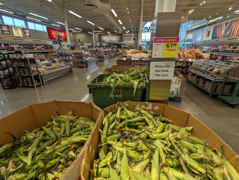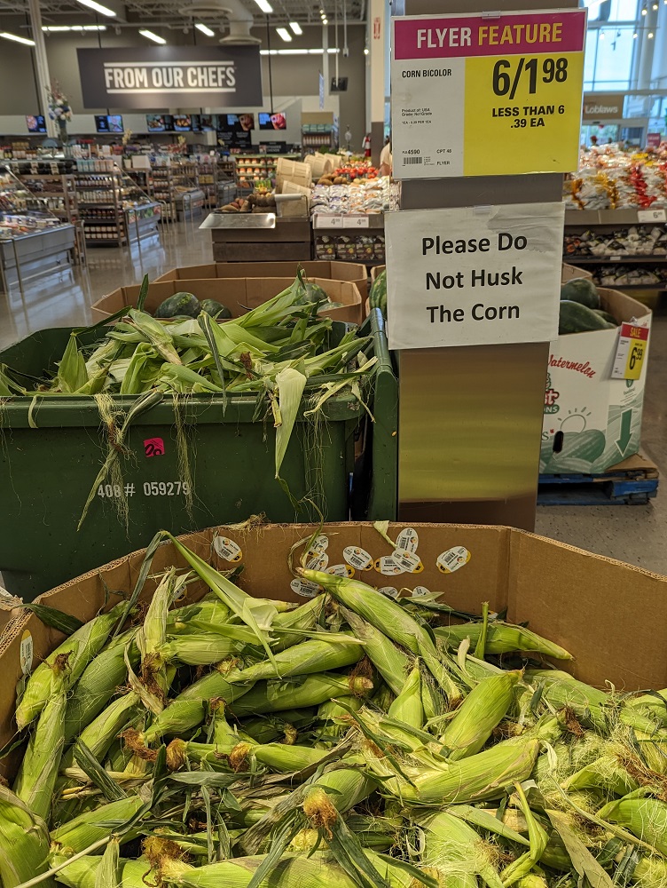 In central Wisconsin stores faced a similar, but yet different problem. At 3$ for a dozen, people were still peeling back the husks to look at the kernels and then throwing back cobs they felt did not meet their personal quality standards. This despite a large sign asking people not to do exactly that. There was no separate bin for the husks. With such a low price, one could certainly take the risk of ending up with the occasional inferior cob