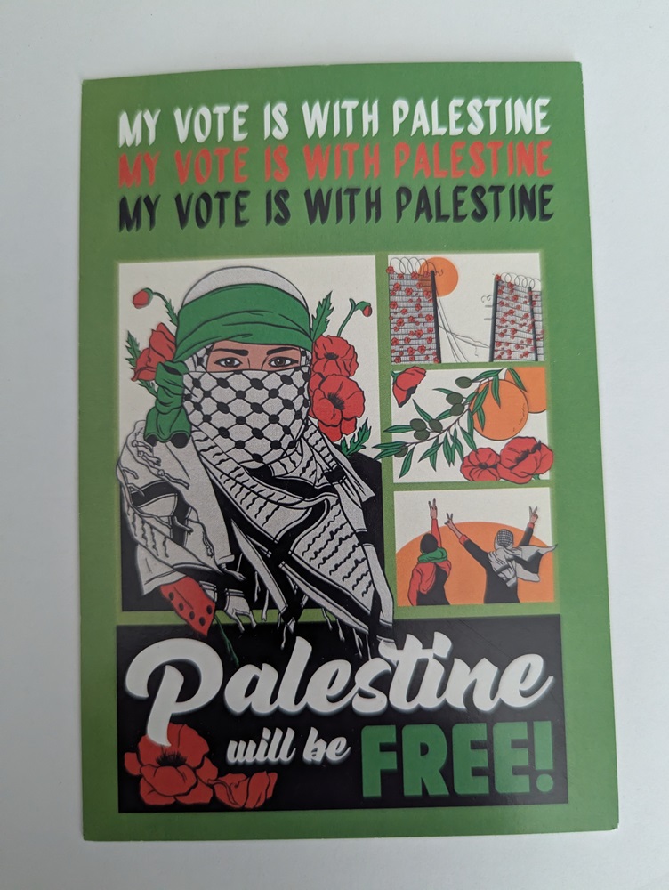 What I find funny with these postcards is that the sender’s say “my vote is with Palestine” when, if they actually lived there it wouldn’t be. I wonder if they know that.